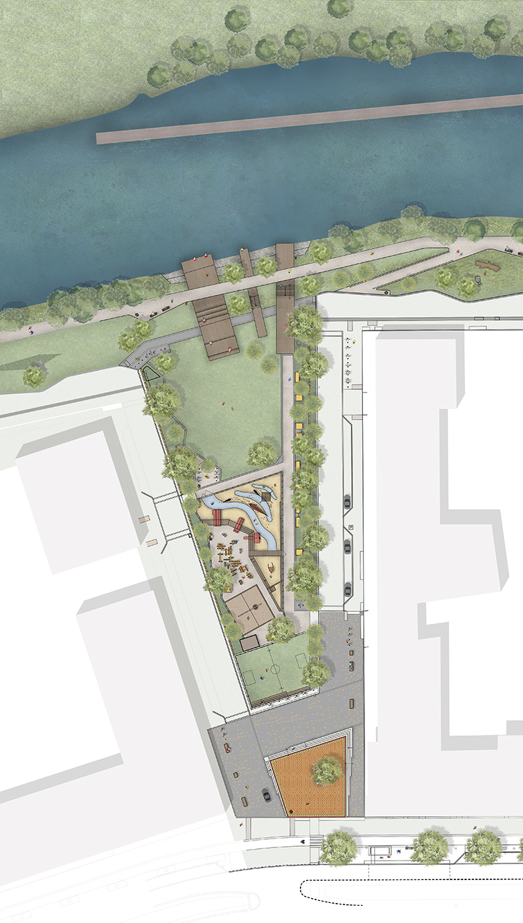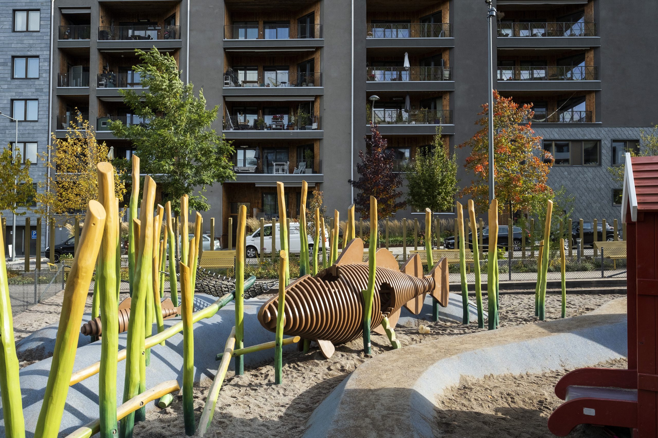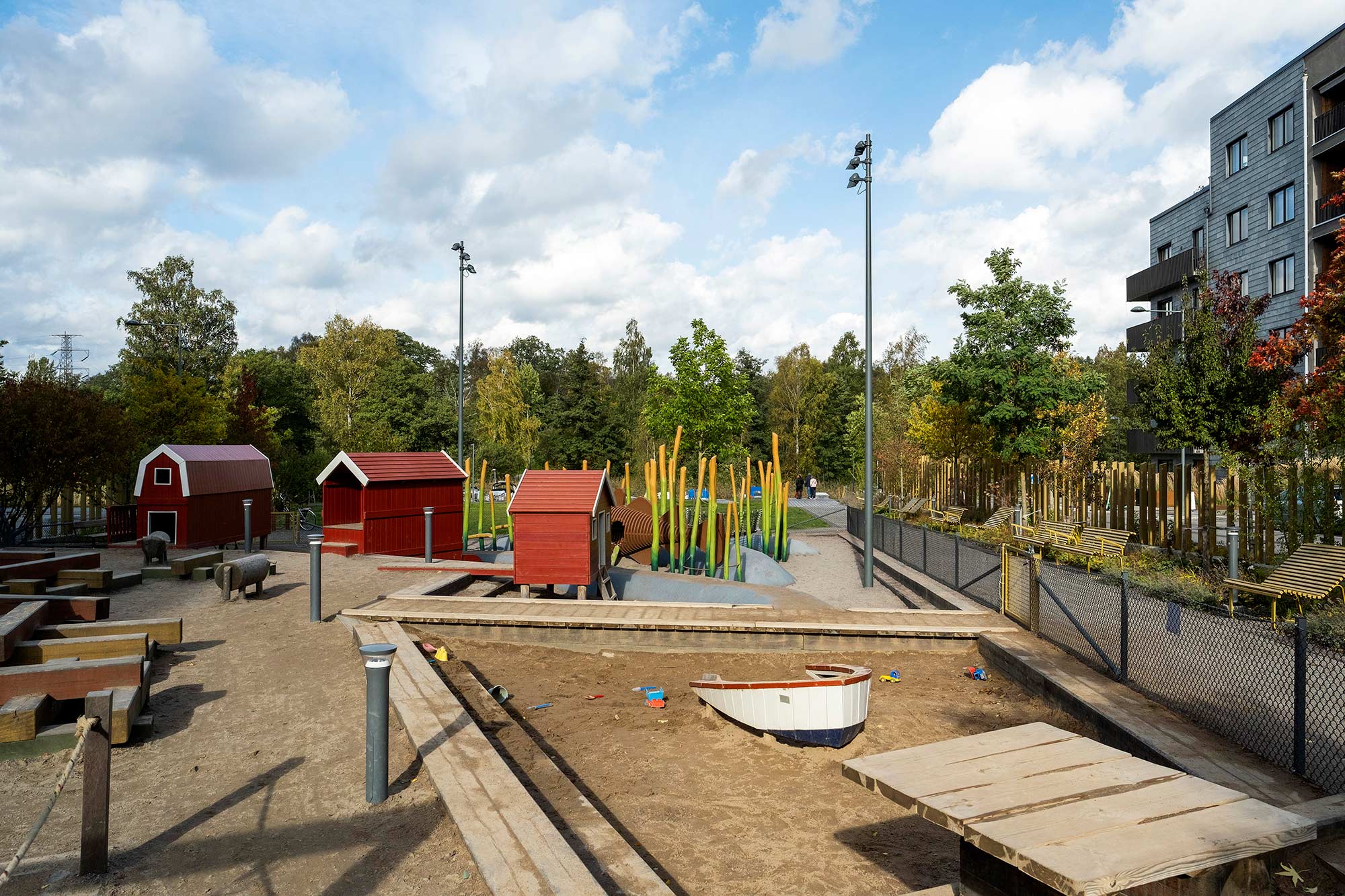 En lekplats i två nivåer ligger centralt i parken. Lekens tema är hämtad från den befintliga omgivningen – ett gammalt båthus i vassen på andra sidan Husarviken har fått inspirera platsen. Den övre nivån är ”land” där gungor, sandlek, trästockar och små djur bildar en liten värld. Tre röda båthus bryggar över mellan land och vatten; till den nedre nivån. I ”vattnet” simmar stora fiskar i vass av stockar, omgivna av klätterbara fiskenät. En bollplan ger plats för aktivitet och bollek och är en mötesplats för många av barnen som bor i området.