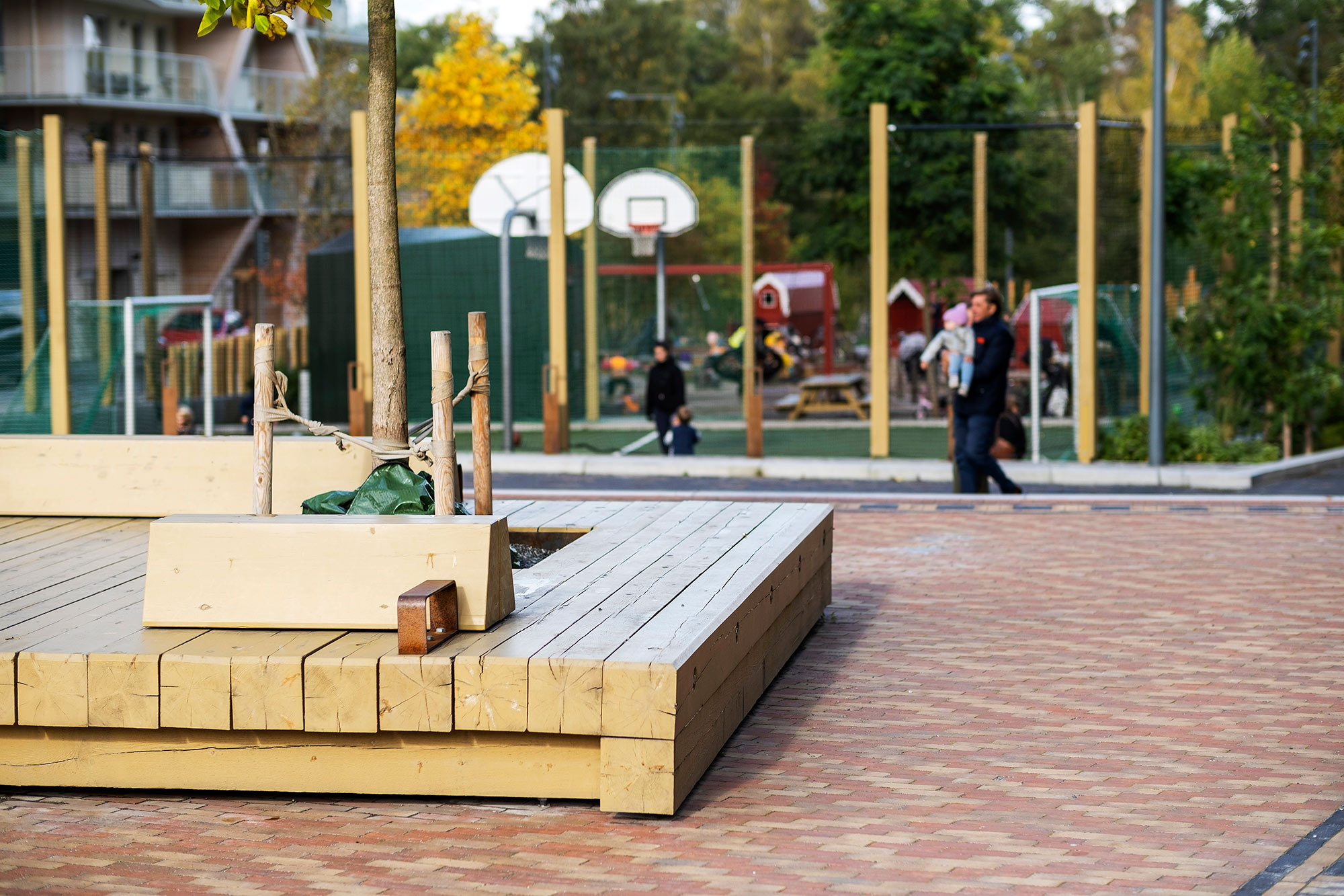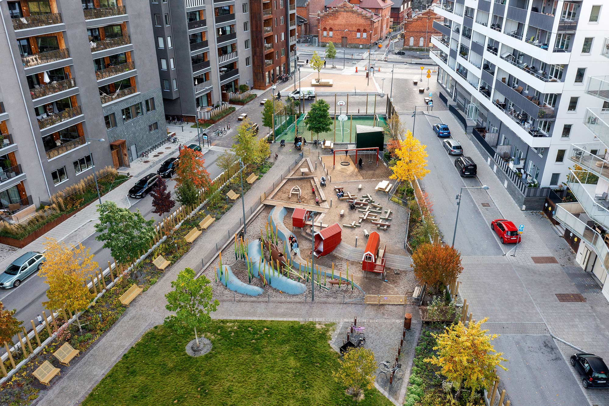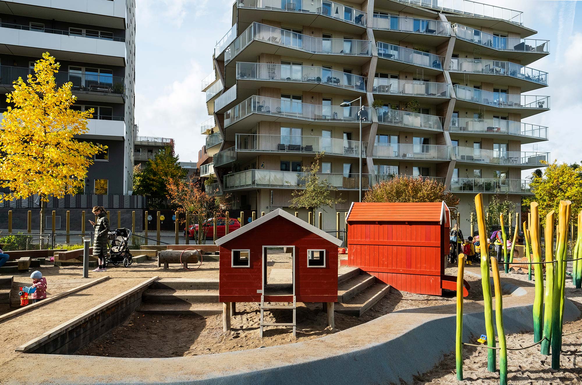En lekplats i två nivåer ligger centralt i parken. Lekens tema är hämtad från den befintliga omgivningen – ett gammalt båthus i vassen på andra sidan Husarviken har fått inspirera platsen. Den övre nivån är ”land” där gungor, sandlek, trästockar och små djur bildar en liten värld. Tre röda båthus bryggar över mellan land och vatten; till den nedre nivån. I ”vattnet” simmar stora fiskar i vass av stockar, omgivna av klätterbara fiskenät. En bollplan ger plats för aktivitet och bollek och är en mötesplats för många av barnen som bor i området.