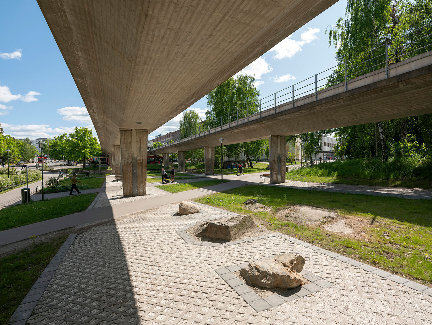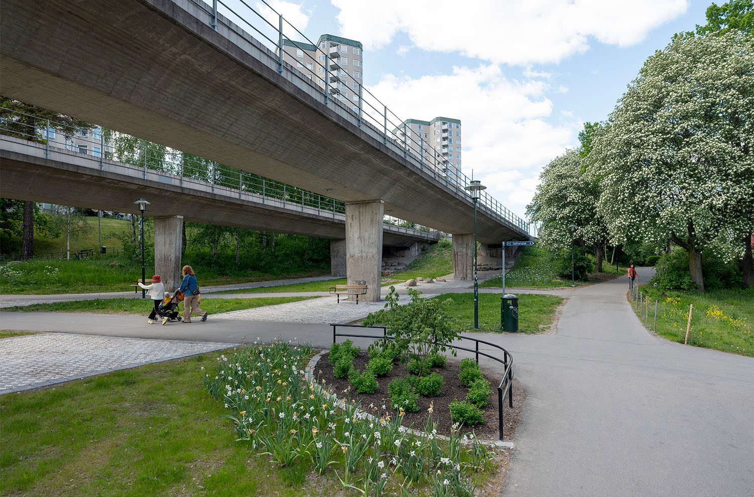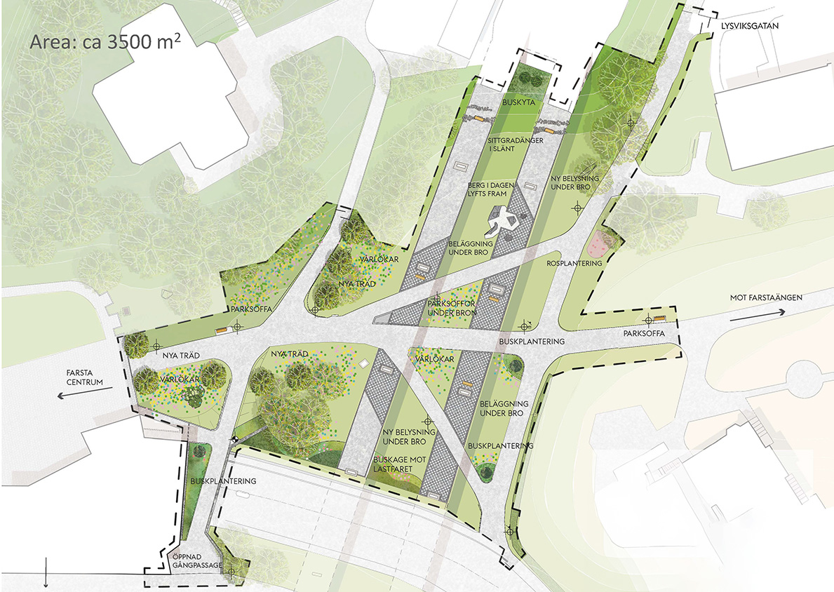Ledord i projektet har varit återbruk, trygghet/tillgänglighet, entréplats/mötesplats, robust utformning.