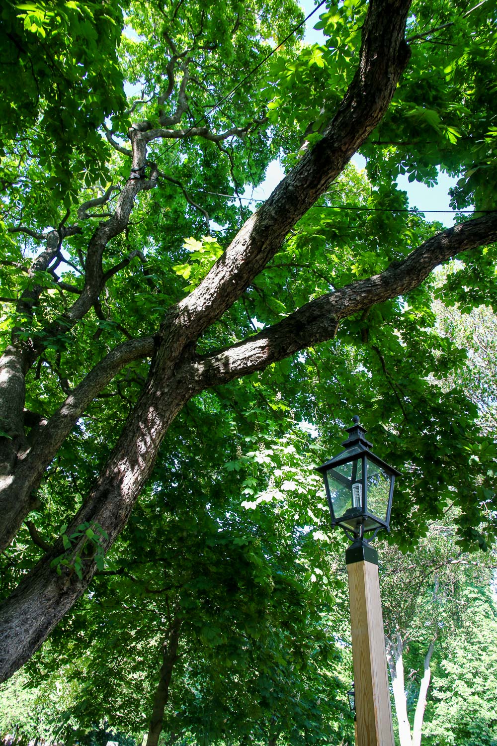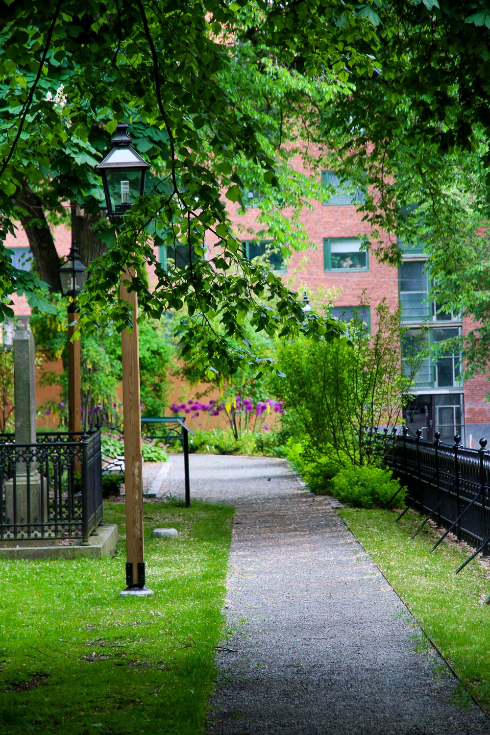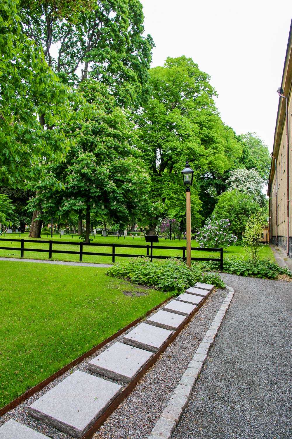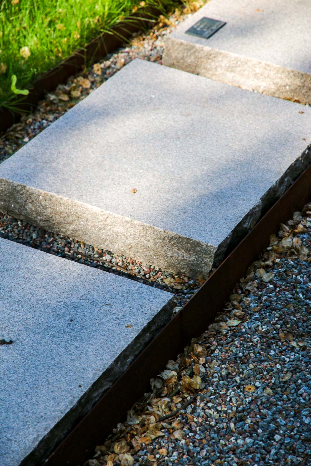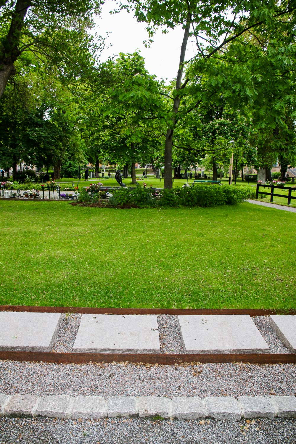 Längs gångstråket sträcker sig rader av gravstenar med plats för 25 namnskyltar på vardera sten. Gångstråket kompletterades med bänkar, belysning och en stabil grund av låga buskar, huvudsakligen Rhododendron. På så sätt blir askgravplatsen både en avskild plats samtidigt som den gör resten av kyrkogården överblickbar. Askgravlunden känns nu som en naturlig del av kyrkogården och underordnar sig platsen på ett diskret sätt trots att den tillför över 1000 gravplatser.