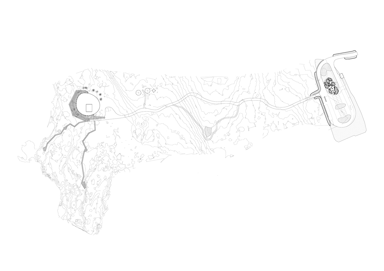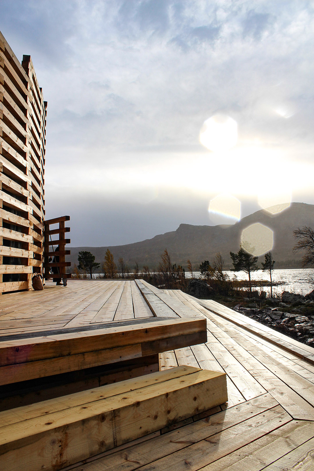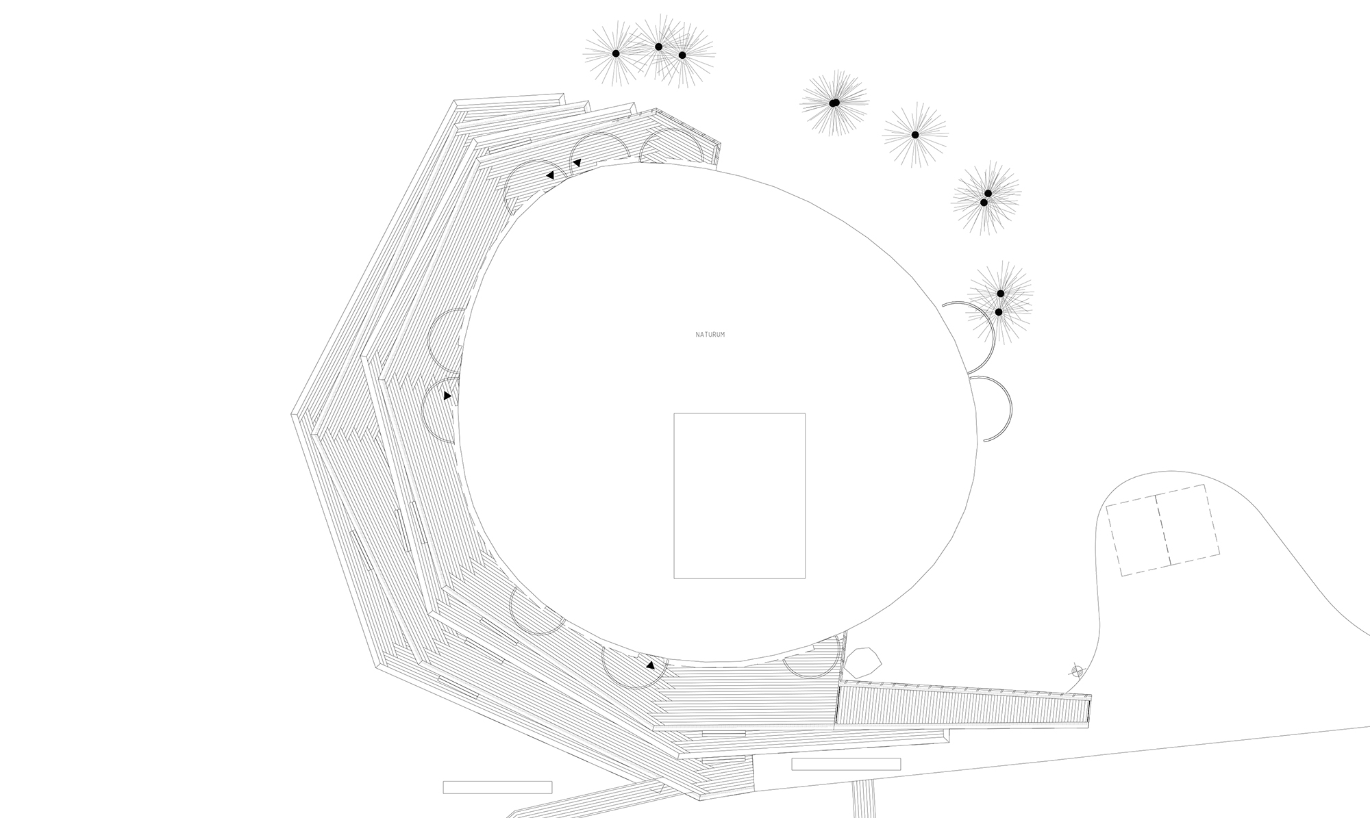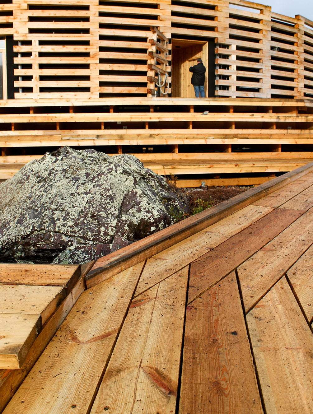 Vi ansvarade för vägar fram till naturrummet, parkeringsytor, spänger och utsiktsplatser i landskapet samt terrasser/trädäck runt själva byggnaden. Allt som byggts runt naturrummet skall i framtiden gå att demontera utan att egentligen lämna några spår efter sig i landskapet. Markingreppen har därför varit få. Eftersom huset står upphöjt på plintar behövs ingen dränering. Besökarna som ska från byggnaden och ut i det omgivande landskapet går på upplyfta träspänger, utformade för att inte skada den sköra vegetationen på marken. Samernas rika hantverkstradition gav också inspiration till att utforma trädäcken och spängerna så att de ger associationer till flätverk.