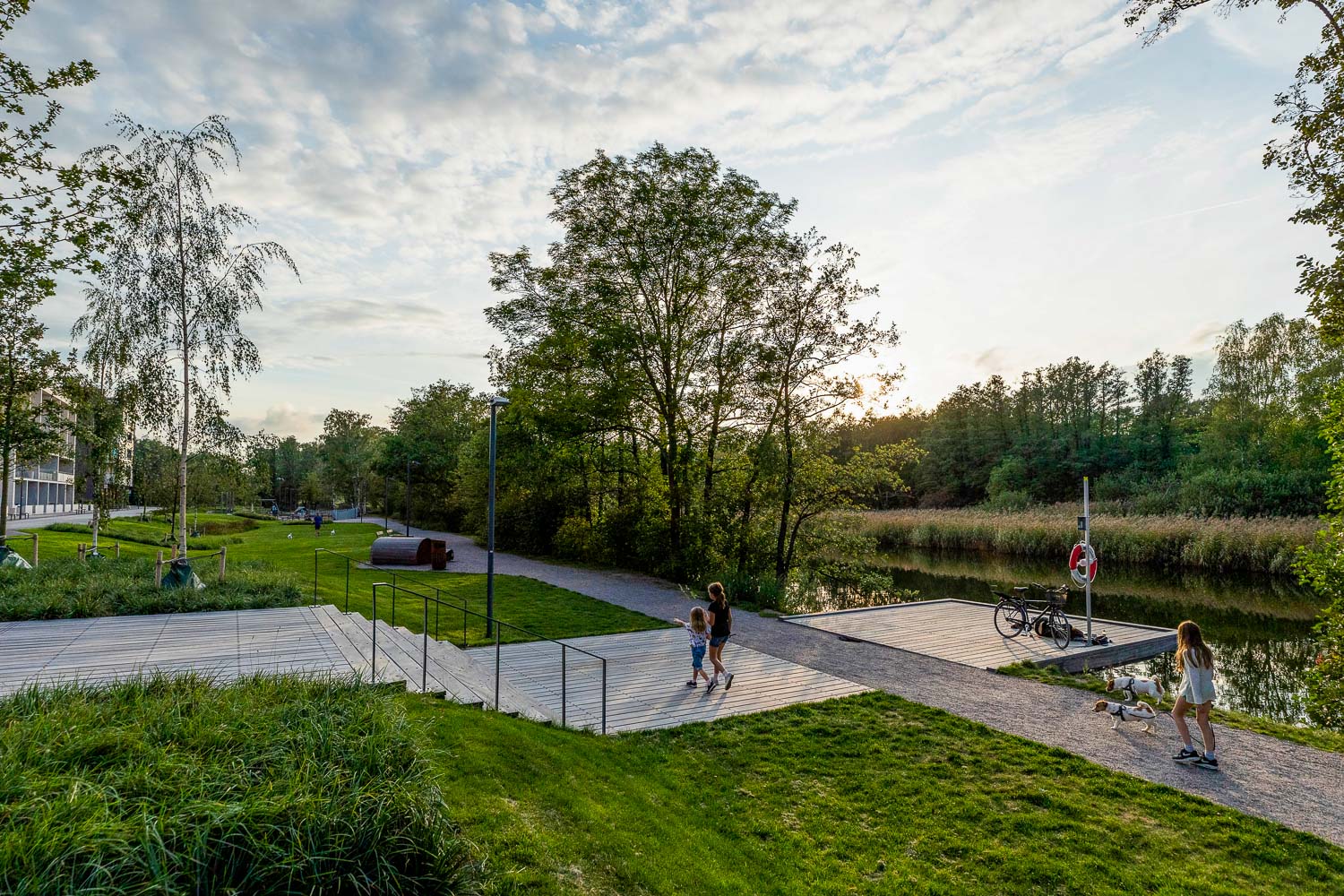 Husarviksparken sträcker sig längs med Husarviken och bildar gränsen mellan husbebyggelsen och naturmarken på Norra Djurgården. Parken innehåller promenad, lekplats, öppna gräsytor och gångfartsgata. Parken klarar stor klimatpåverkan med kraftiga regn och är dimensionerad för att stora ytor ska kunna infiltrera nederbörden, med konsekvens att planteringar och gräsytor tidvis står under vatten.