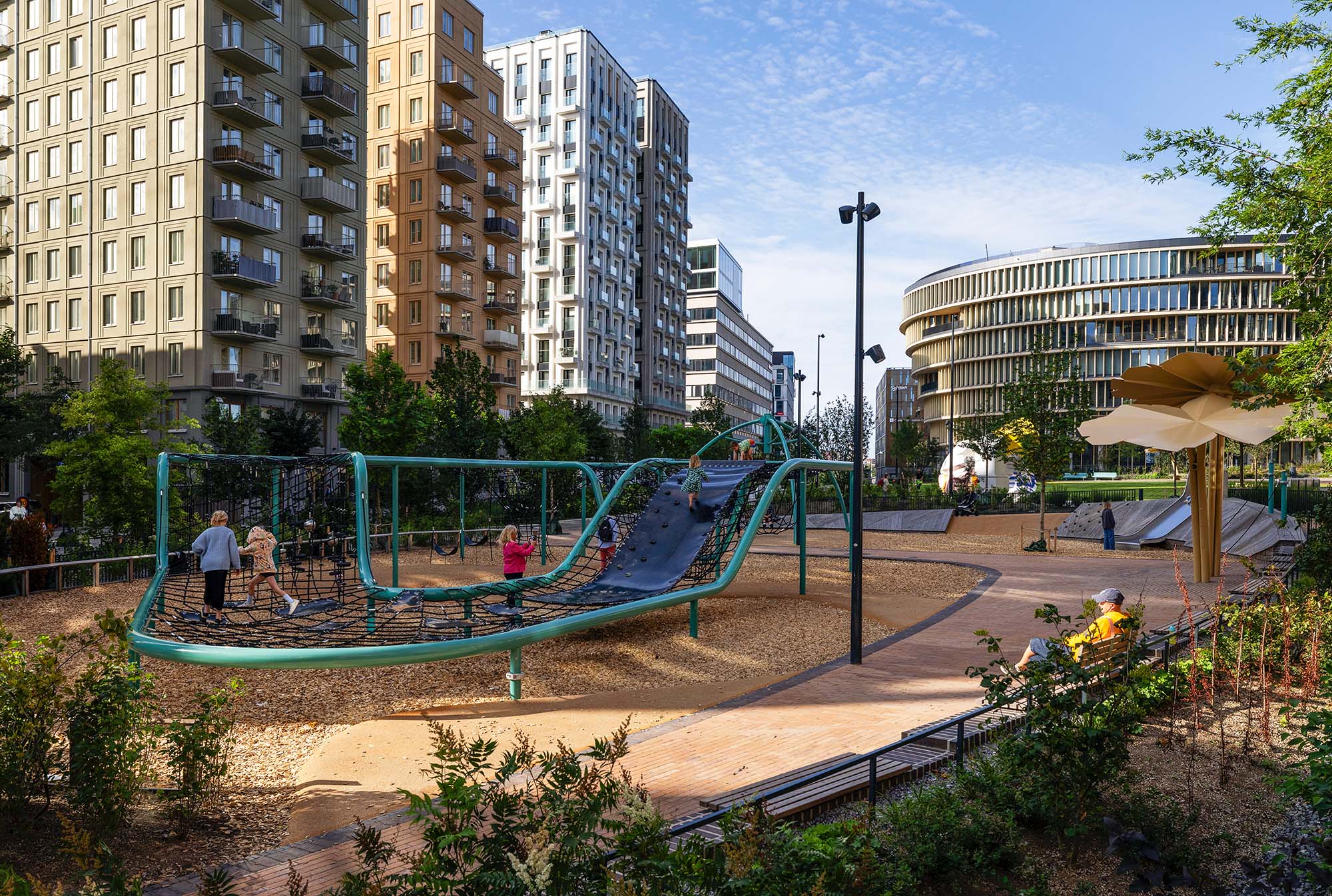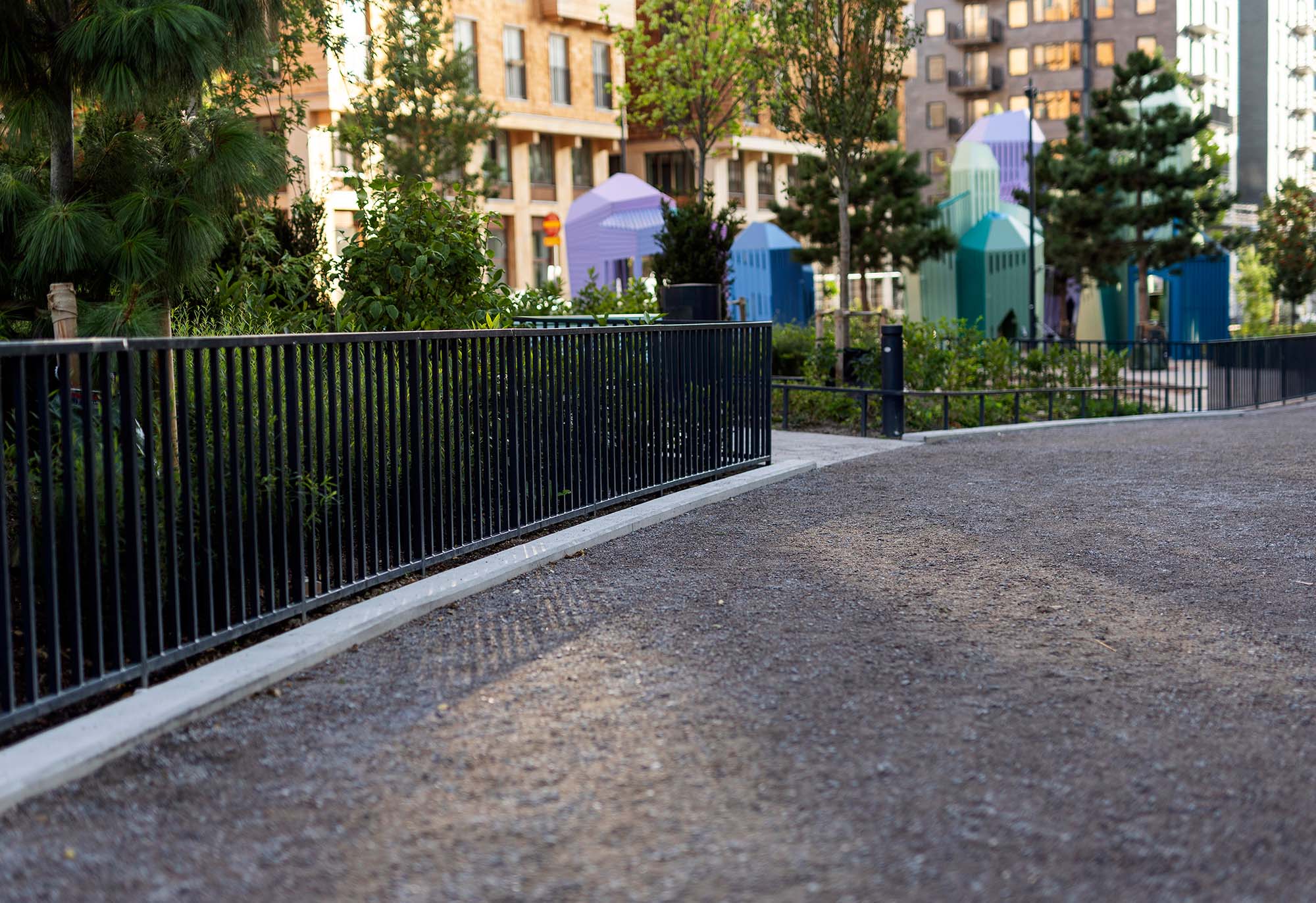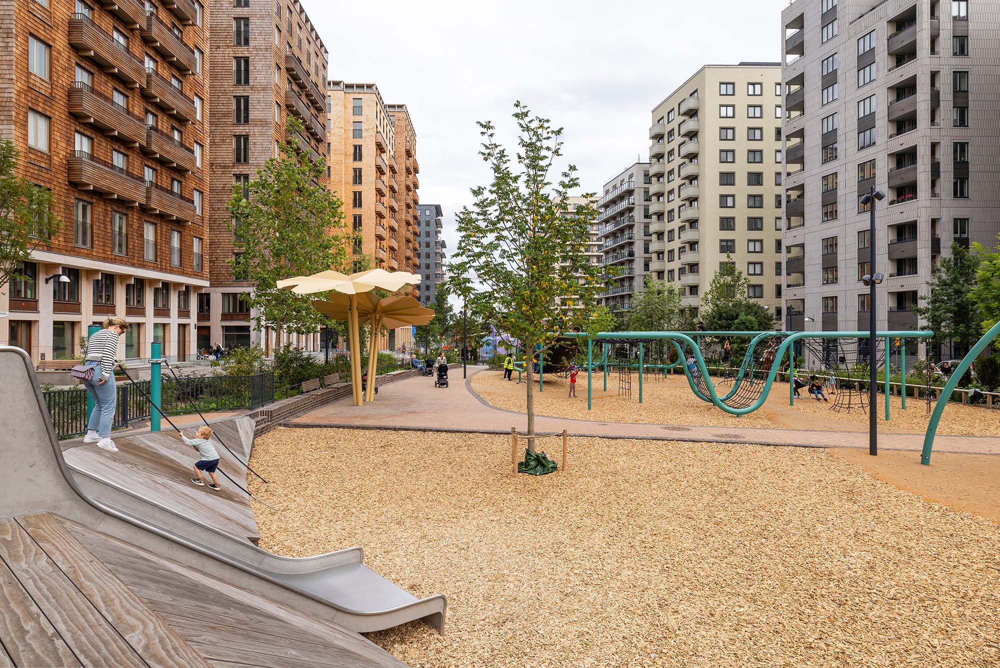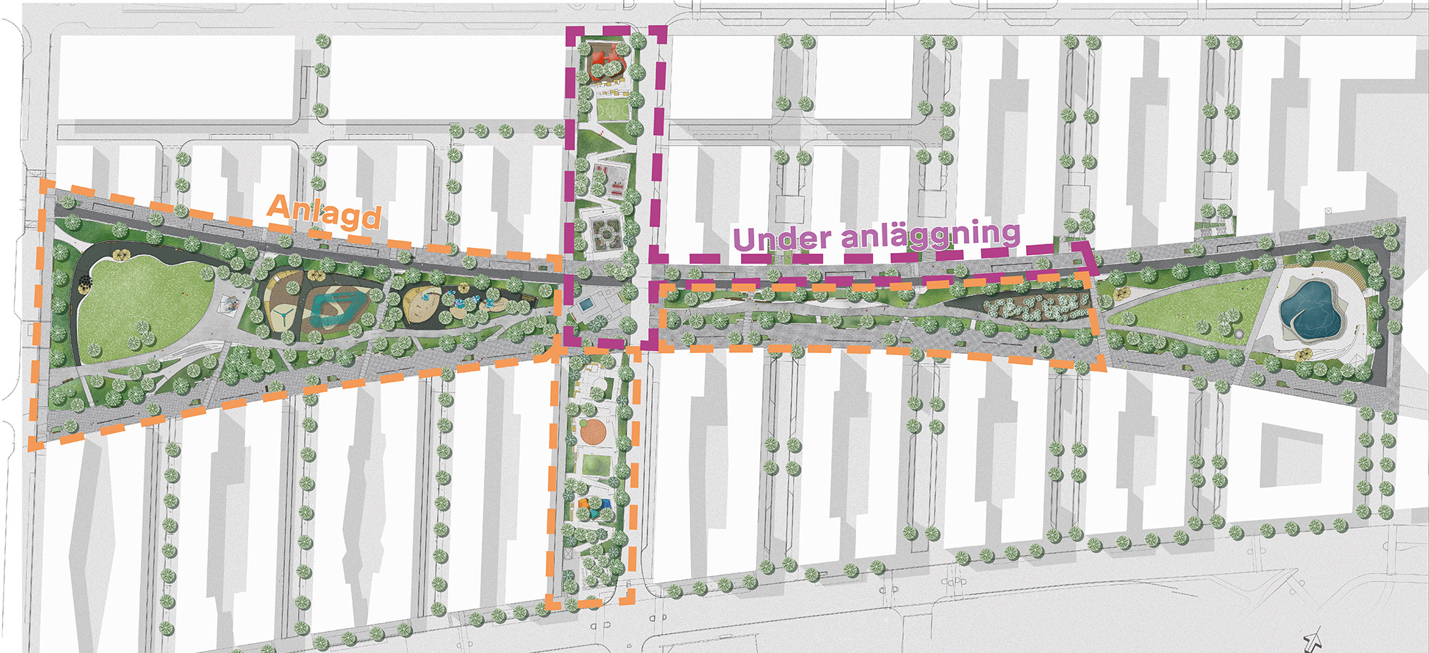 Delar av den nord-sydliga delen av parken är redan anlagd och är utformad som en serie tydliga rektangulära terrasserade lek- aktivitets- och parkytor för olika åldersgrupper. Den sluttar sluttar kraftigt Från norr till söder och tar upp en höjdskillnad på fem meter. Genom parken slingrar sig ett rampsystem som ökar tillgängligheten. Mellan ramperna skapas parkrum med aktivitetsbaserat innehåll.