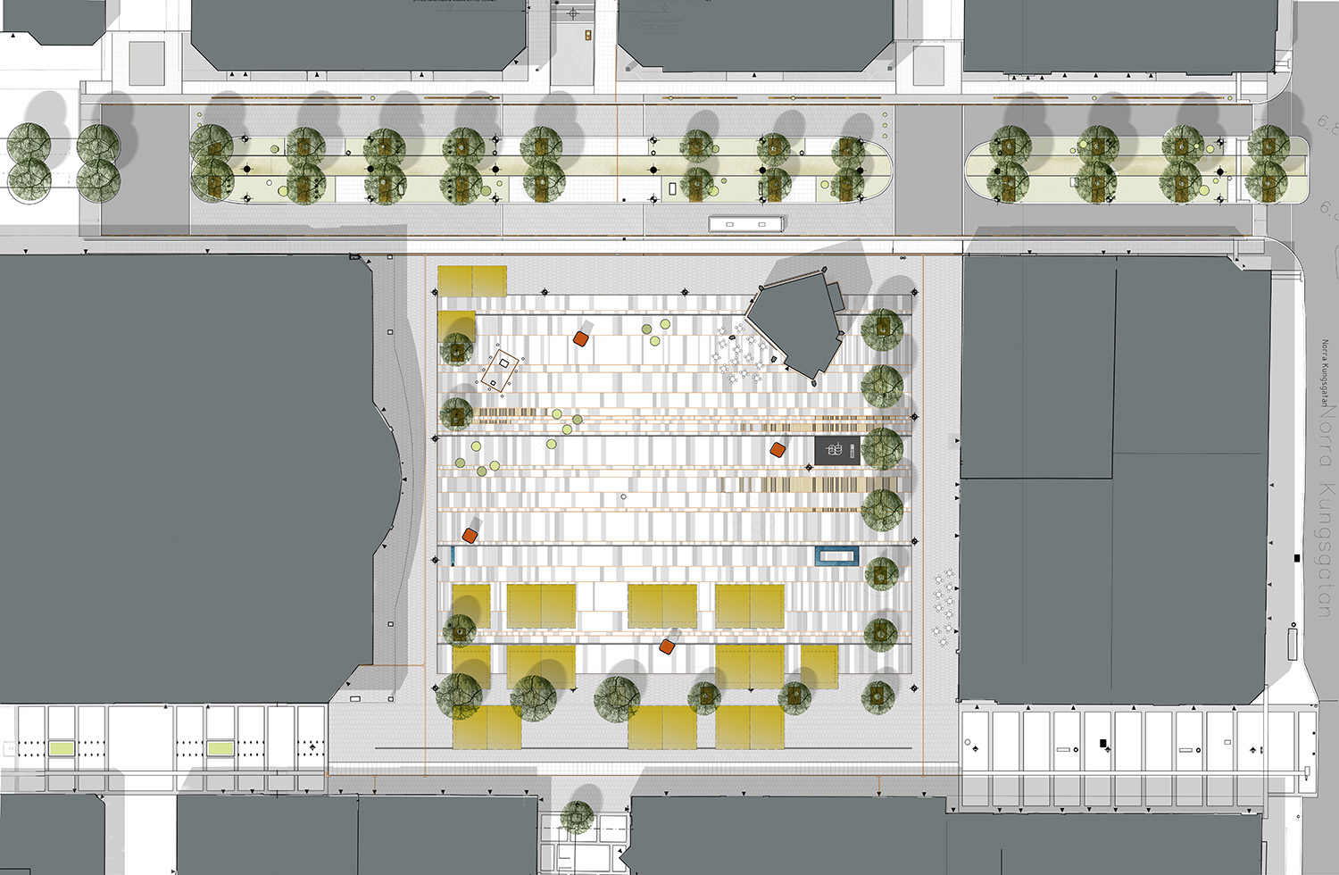 Handelstorgets marknadsplatser är uppdelade i kvarter längs Drottninggatan, på torgets södra del. handelsplatserna är utformade med tak av solgul textil, formgivna för Stortorget.