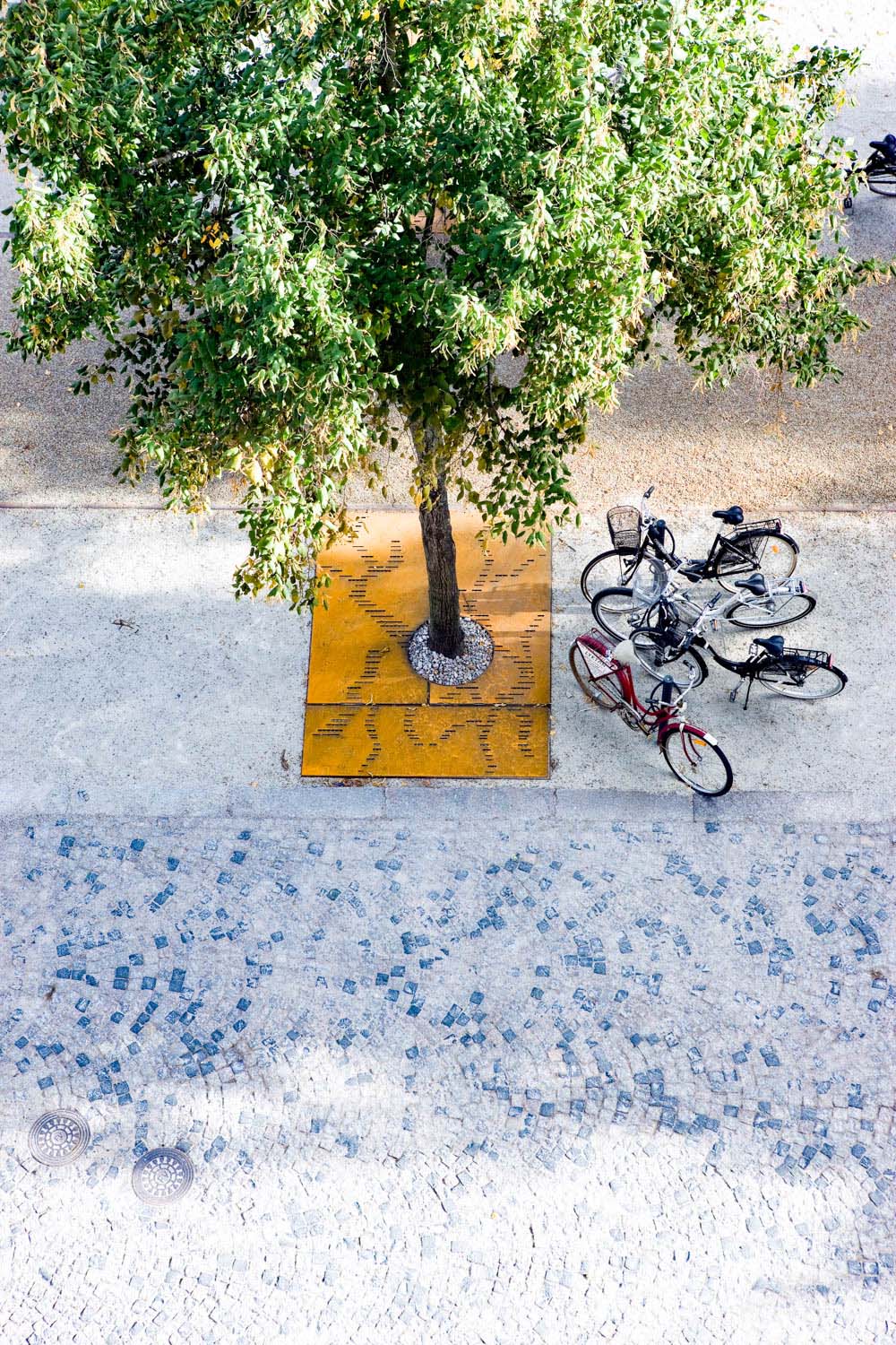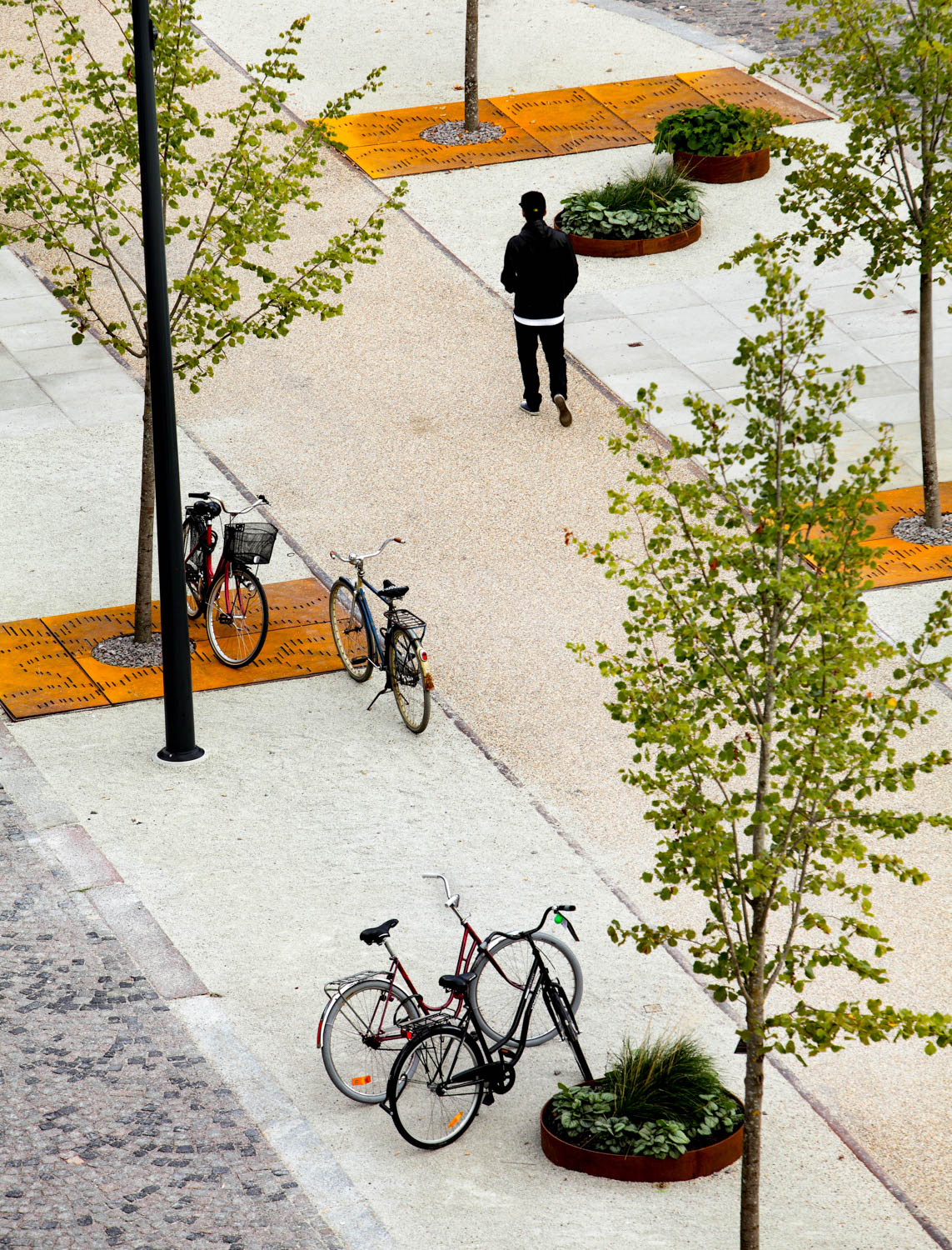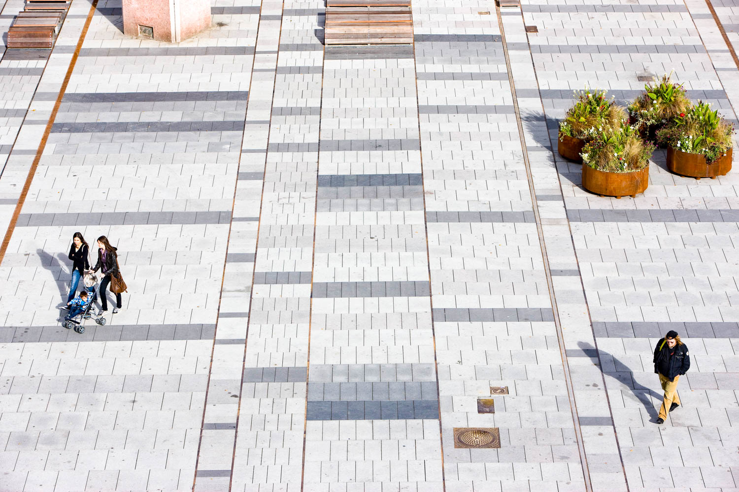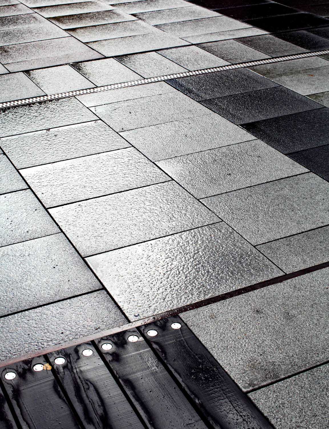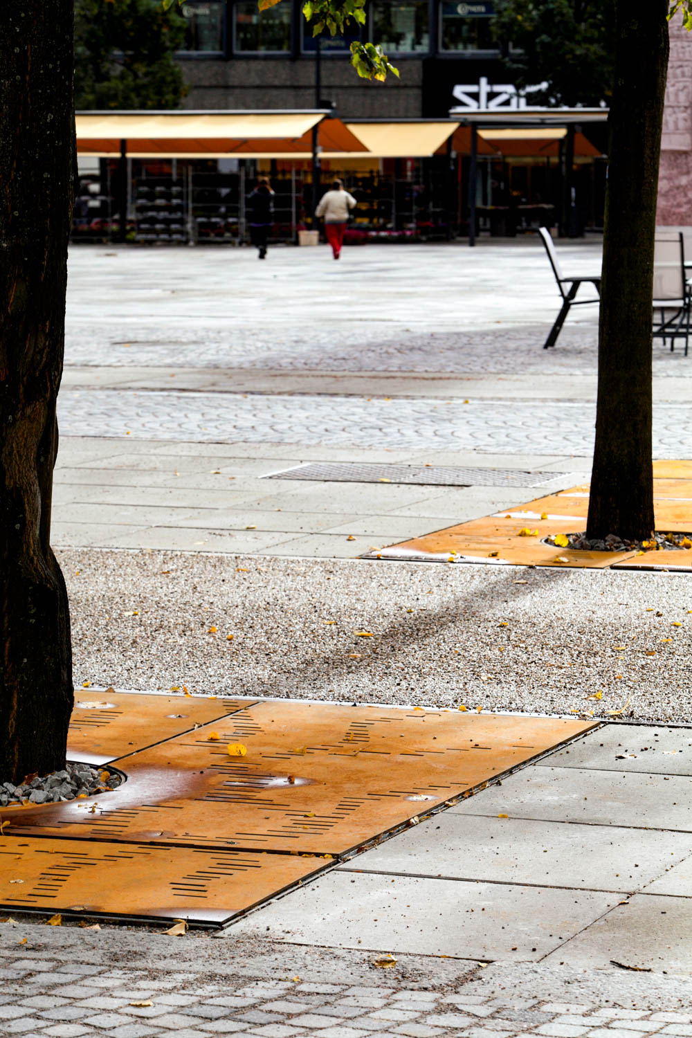 Centralt på torget ligger en slät, rektangulär yta, en väv av granithällar i olika nyanser och ytbearbetningar. Tre granitsorter med två olika ytbearbetningar, flammad och krysshamdrad, ger sex olika nyanser som gör att golvet växlar uttryck beroende av ljus och väderlek. Band av rosttrögt stål med olika bredd delar in mattan i olika fält. Stålbanden är vävens varp, den längsgående tråden i en vävd matta.